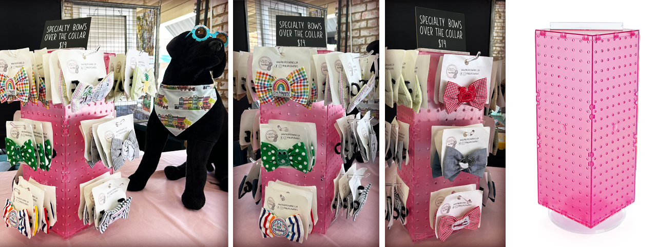 We always love seeing our displays out in the world, and Pineapple Paw Prints caught our eye at a local fair in Charleston, South Carolina with their vibrant pink pegboard setup. Their booth was filled with adorable dog bandanas and bows, perfectly arranged on the rotating display for easy browsing. This mother-daughter-run business started as a small project during the pandemic and has since grown into a go-to shop for pet lovers looking for unique, high-quality accessories. Their setup was not only attention-grabbing but also practical—a great example of how a well-organized display can elevate a brand’s presence at events.