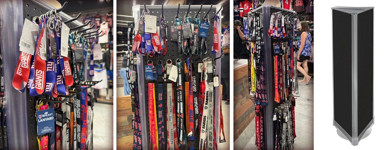 With everything hung just right, sorted by color or style, your customers will easily be able to shop knowing exactly where things are. No more digging through bins or opening mystery boxes labeled “miscellaneous” (a word that strikes fear into even the most seasoned shopkeepers). See how our friends at Lids use our Three-Sided Pegboard Tower Floor Display (SKU 700450) to showcase their NFL lanyards, ideally placed to capture those impulse buys on the way to the register! The black pegboard and hooks are the perfect backdrop to show off every team’s colors. Our wide selection of accessories make it a breeze to update as often as you like - change it up by adding some acrylic trays, buckets, even wire bins. No matter what you want to display, a well-planned pegboard planogram keeps everything in view and within reach.