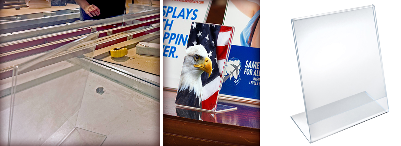Whether you are adding a touch of elegance to your office with our Clear Acrylic Thick Deluxe Riser (SKU 515367),or displaying your favorite photos in our sleek Angled L-Shaped Sign Holder Frame with Slant Back Design (SKU 112712), you're not just buying “Made In The USA” — you're telling a story.