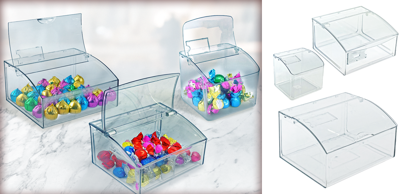 Crafted from high-quality clear styrene, with hinged lids for easy access, these bins are designed to sit securely on a countertop or shelf. The front facing slot provides space to display product information, providing a polished and professional look. Available in three different sizes, our SKU’s 400435, 400433, and 400432 are available now for pre-order, arriving in time to display Holiday goodies with charm and practicality!