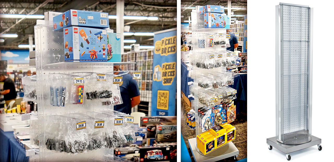 Our friends at Pickle Bricks attended the recent ToyCon NJ show and used our popular Two-Sided Pegboard Floor Display on a Revolving Wheeled Base (SKU 700258), to showcase their legos and accessories. The wheels allow for easy movement around the showroom floor, and lock when in place. Add a sign with your logo for personalization, or a shelf to highlight your star products. Available in several colors and made of durable acrylic, this display is easy to assemble and can stand up to high traffic areas. So next time you’re prepping for a trade show, skip the bulky backdrop and go for a sleek, organized pegboard setup.