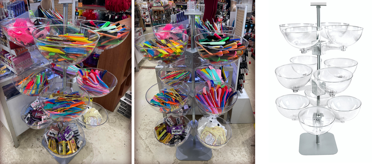 As shown in the photos below, sent to us from our good friends at Coco Beauty Supply, our Quad Arm Bowl Tower (SKU 750344) is crafted with careful attention to detail. Each bowl is made of sturdy and sleek Polycarbonate and boasts a generous diameter of 14 inches, providing ample space for an array of items. Customers can quickly view and reach items without crowding the counter, which is especially valuable in high-traffic areas.The tower is compatible with a variety of different sign holders, making it easy to add your branding and swap it out as seasons and product offerings change. Add dividers to display an even wider selection of products.