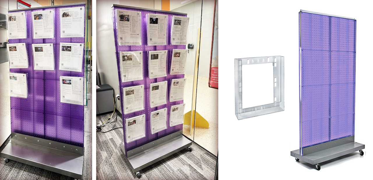 Our friends at Milwaukee Area Technical College uses Azar's Two-Sided Double Pegboard Floor Display on Wheeled Base (SKU: 700732) to create a visually appealing focal point that encourages students to pause and browse announcements about upcoming workshops and campus events. Our wide selection of brochure and business card holders (shown here with our Single Bifold Modular Brochure Holder, SKU: 252429), hooks and shelves make it easy to update regularly to ensure the information remains current and relevant. Large and sturdy, this two-sided pegboard floor display stands on a heavy duty rectangular silver metal base with locking wheels, making it easy to move around to different locations. By combining organization, accessibility, and a touch of color, you can create a thoughtfully designed physical space while connecting people with the resources and information they need.